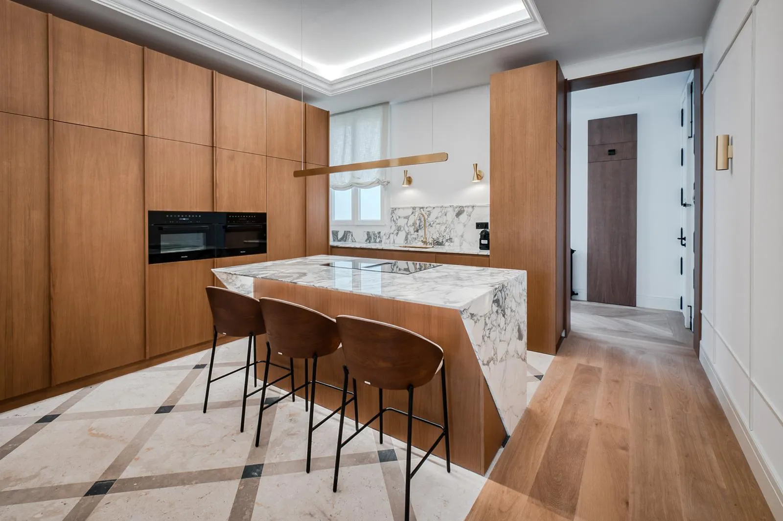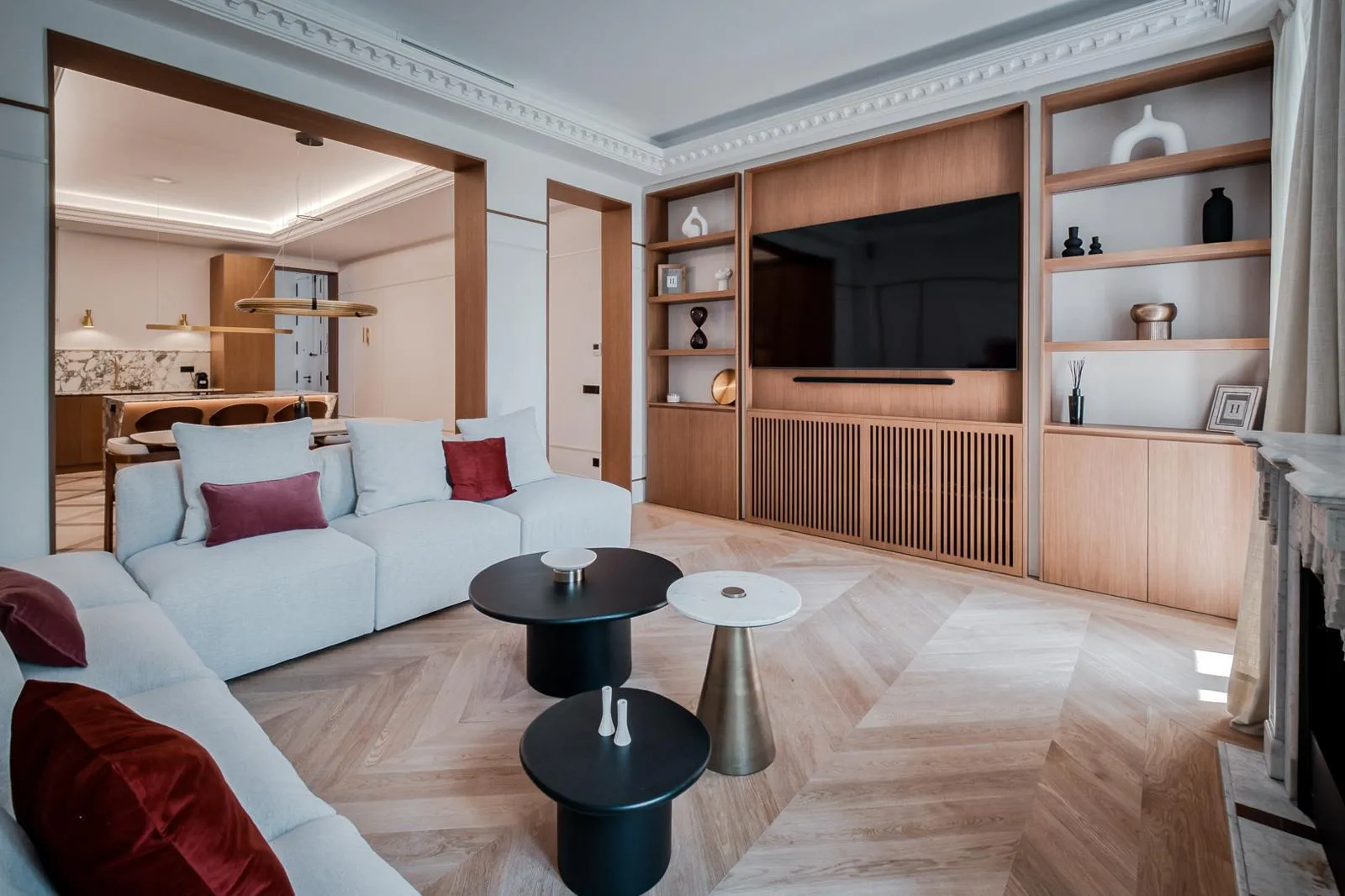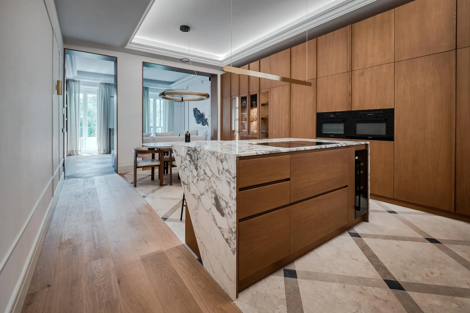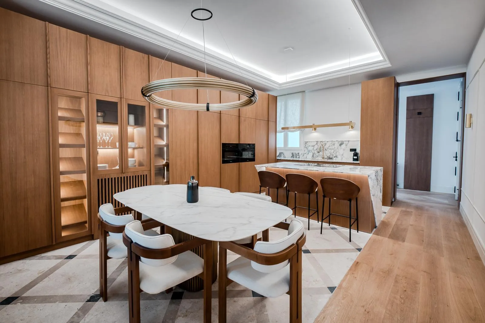 El salón, con orientación sur, recibe una luz natural excepcional durante todo el día, creando un ambiente cálido y acogedor. La cocina de concepto abierto, con acabados en madera natural y mármol alabastro, se integra de manera armoniosa con la zona social, perfecta para recibir invitados o disfrutar del día a día con estilo.