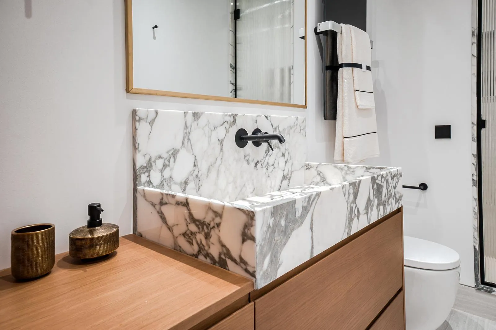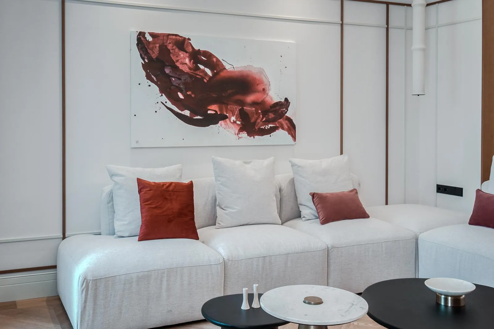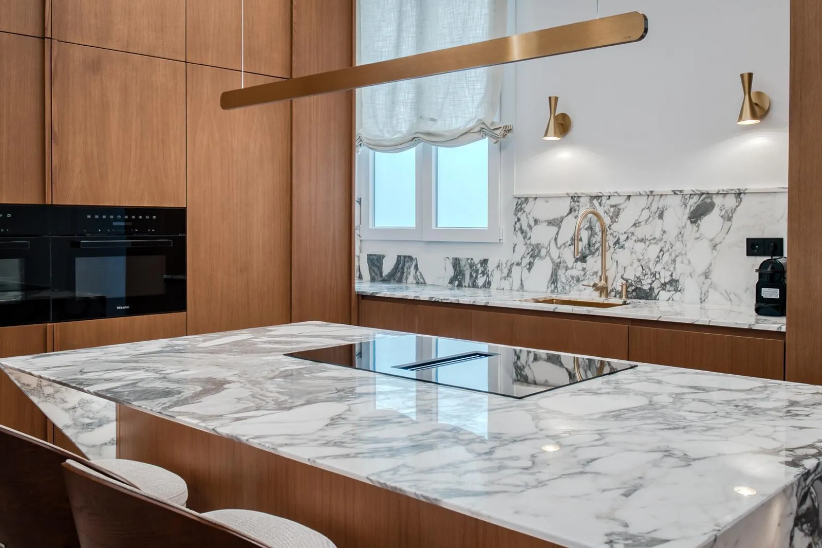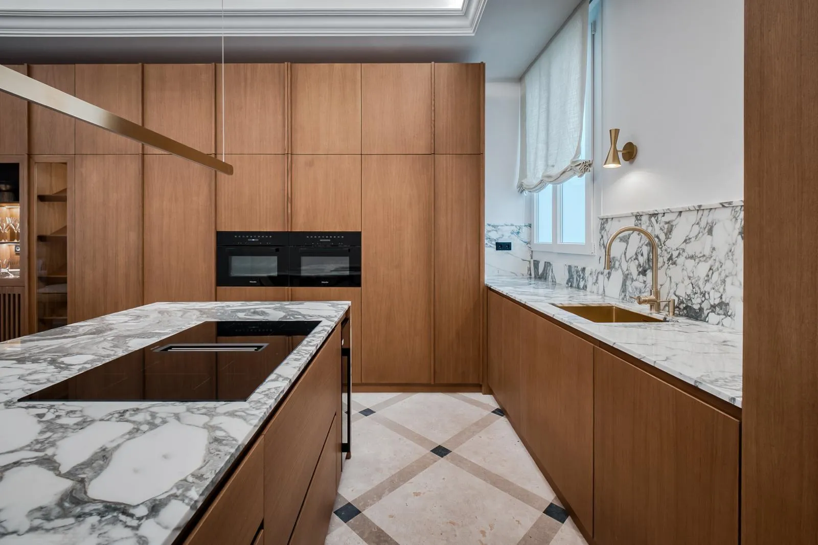 El salón, con orientación sur, recibe una luz natural excepcional durante todo el día, creando un ambiente cálido y acogedor. La cocina de concepto abierto, con acabados en madera natural y mármol alabastro, se integra de manera armoniosa con la zona social, perfecta para recibir invitados o disfrutar del día a día con estilo.