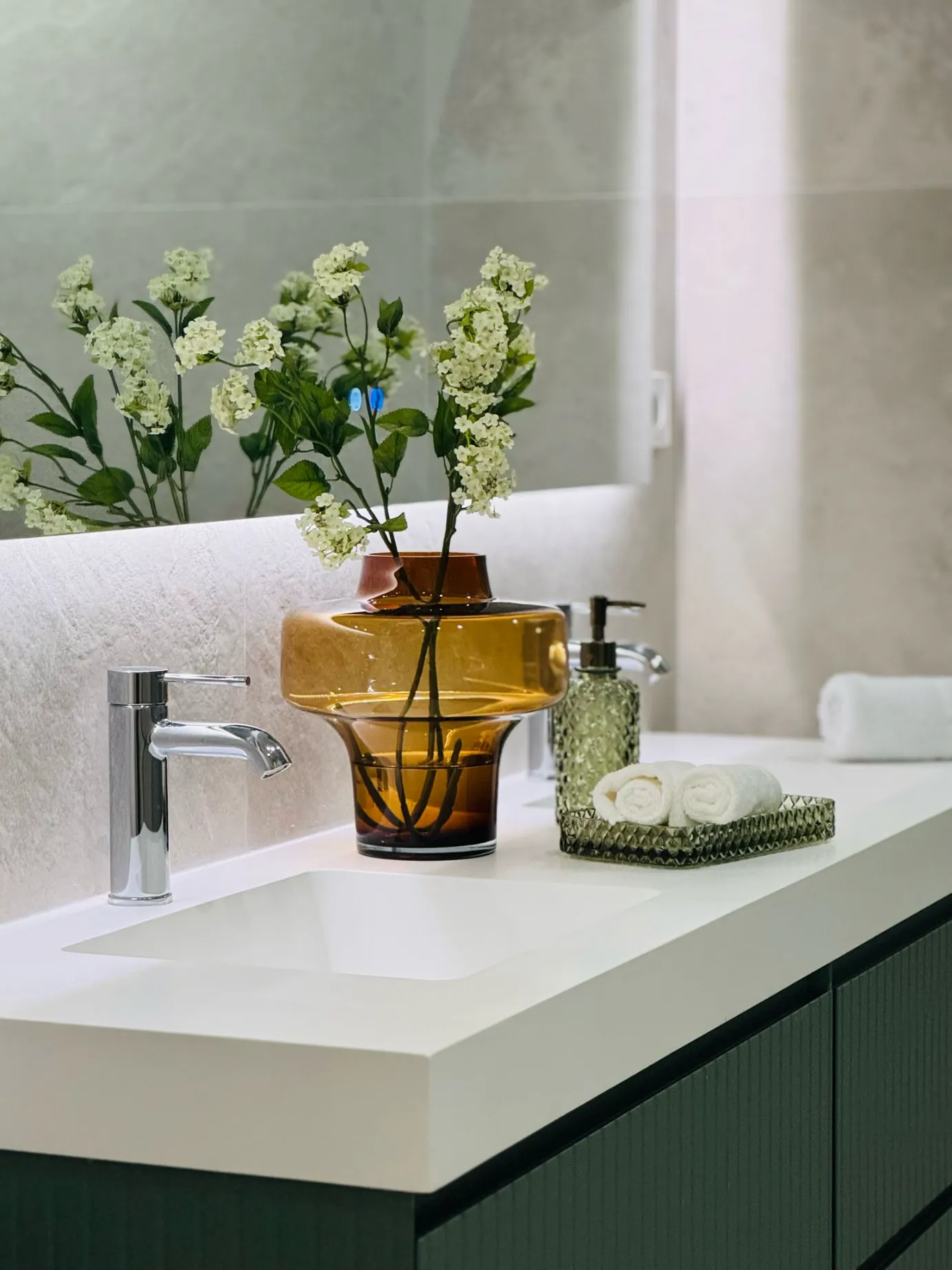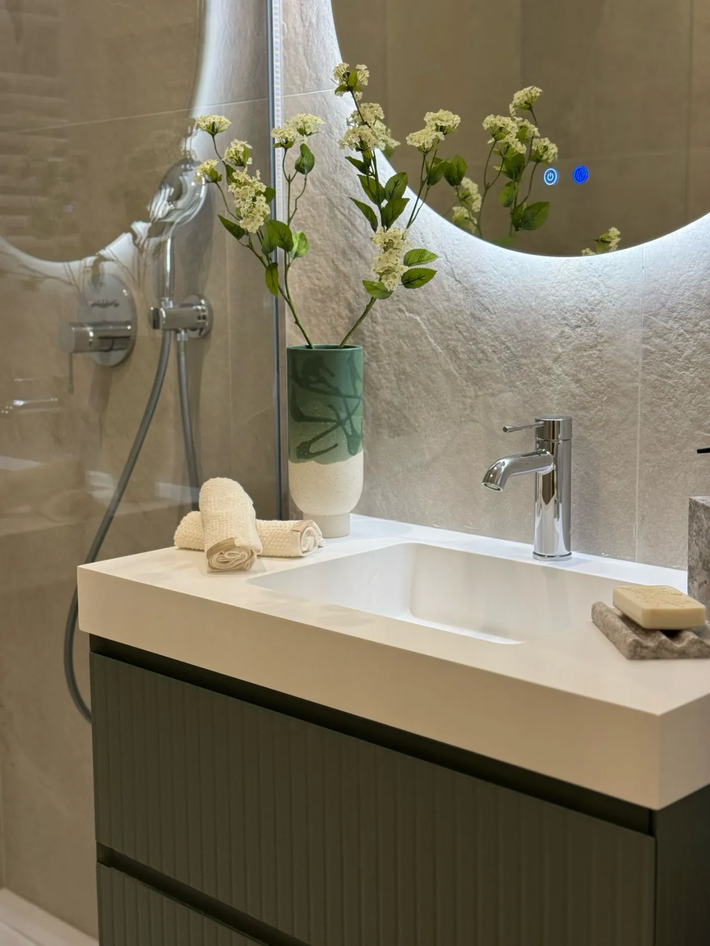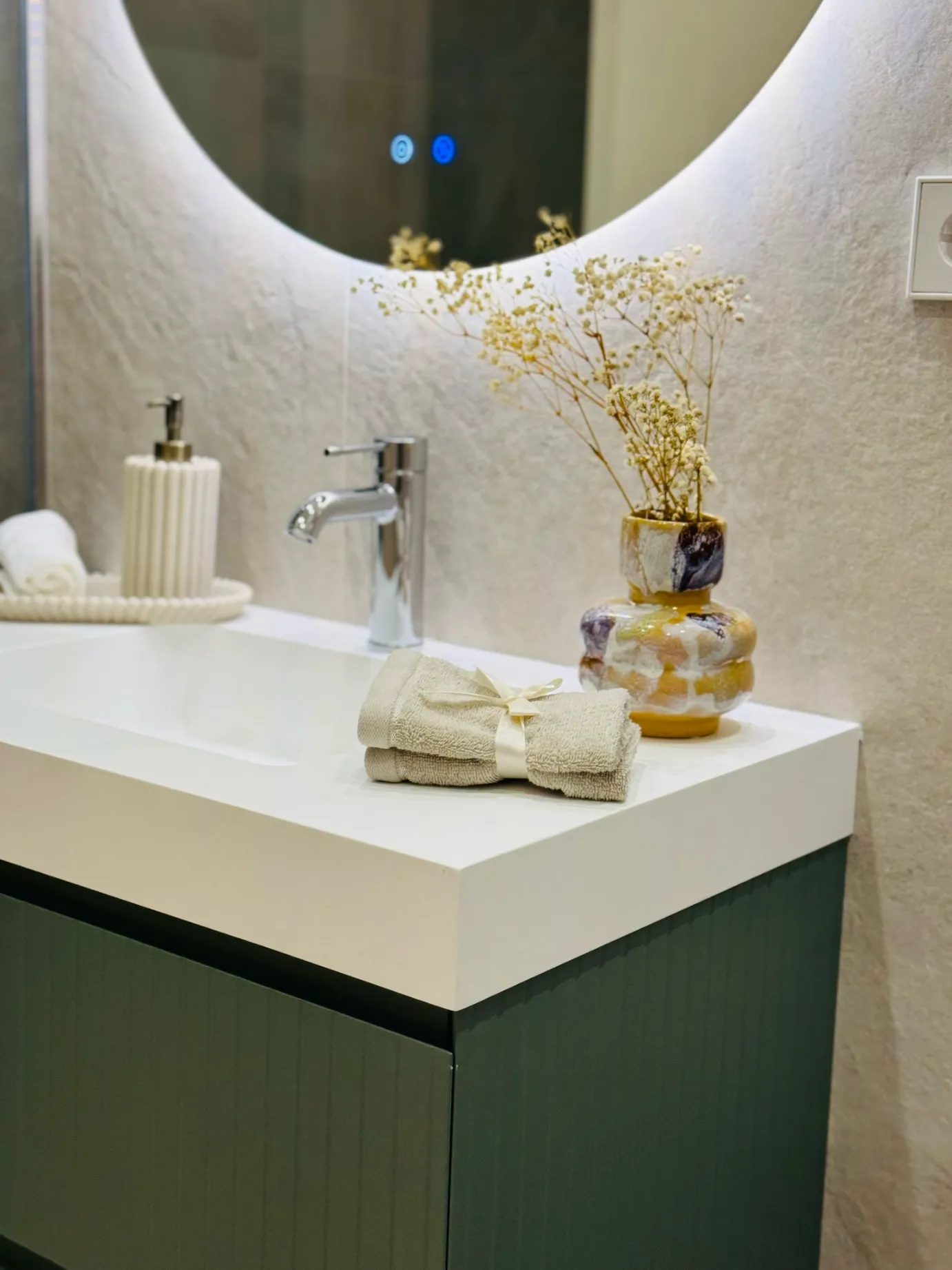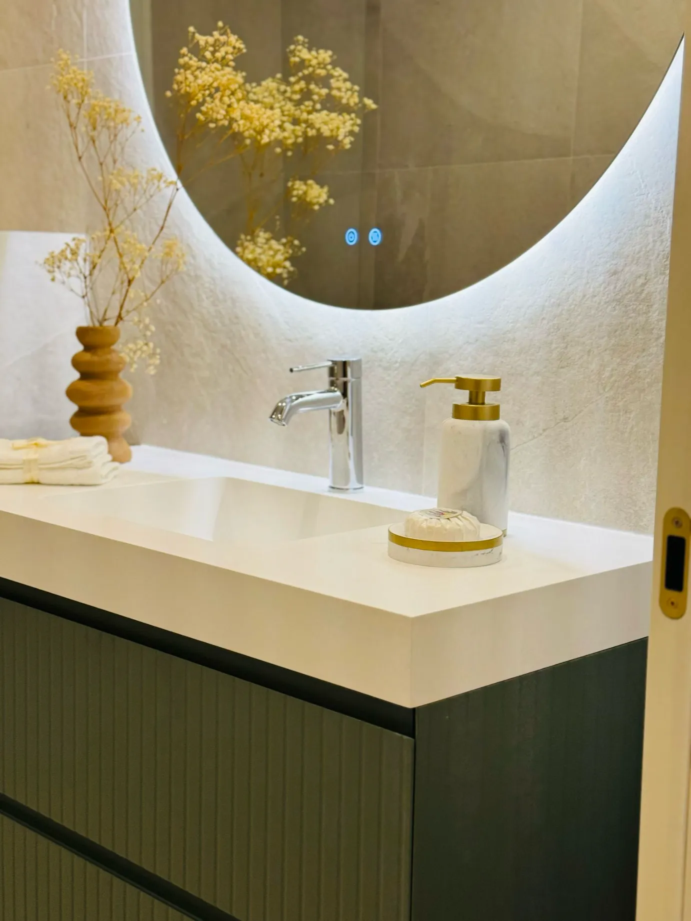 En la zona privada encontramos cuatro dormitorios dobles en suite, dos de ellos exteriores, todos con excelente iluminación natural. Los baños están revestidos con cerámica italiana de la firma MARAZZI y equipados con grifería y sanitarios de alta gama (GROHE). El aseo de cortesía y la zona de lavandería independiente completan una distribución muy bien pensada para la vida diaria.