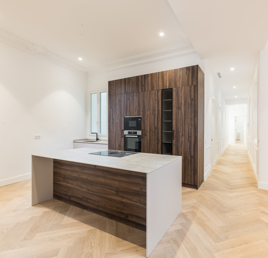 Durante cuatro meses, Dcore llevó a cabo una reforma integral que combina elegancia clásica y lujo moderno. Los baños en mármol con doble lavabo transmiten equilibrio y refinamiento; la cocina moderna con isla y encimera de piedra aporta carácter y practicidad; y los dormitorios, con cabeceros de obra y tonos cálidos, invitan al descanso. La entrada luminosa con suelos en espiga y los salones amplios con molduras originales y ventanales refuerzan la identidad madrileña del espacio. Un proyecto donde el diseño se viste de lujo y cada detalle refleja la excelencia y precisión que caracterizan a Dcore.